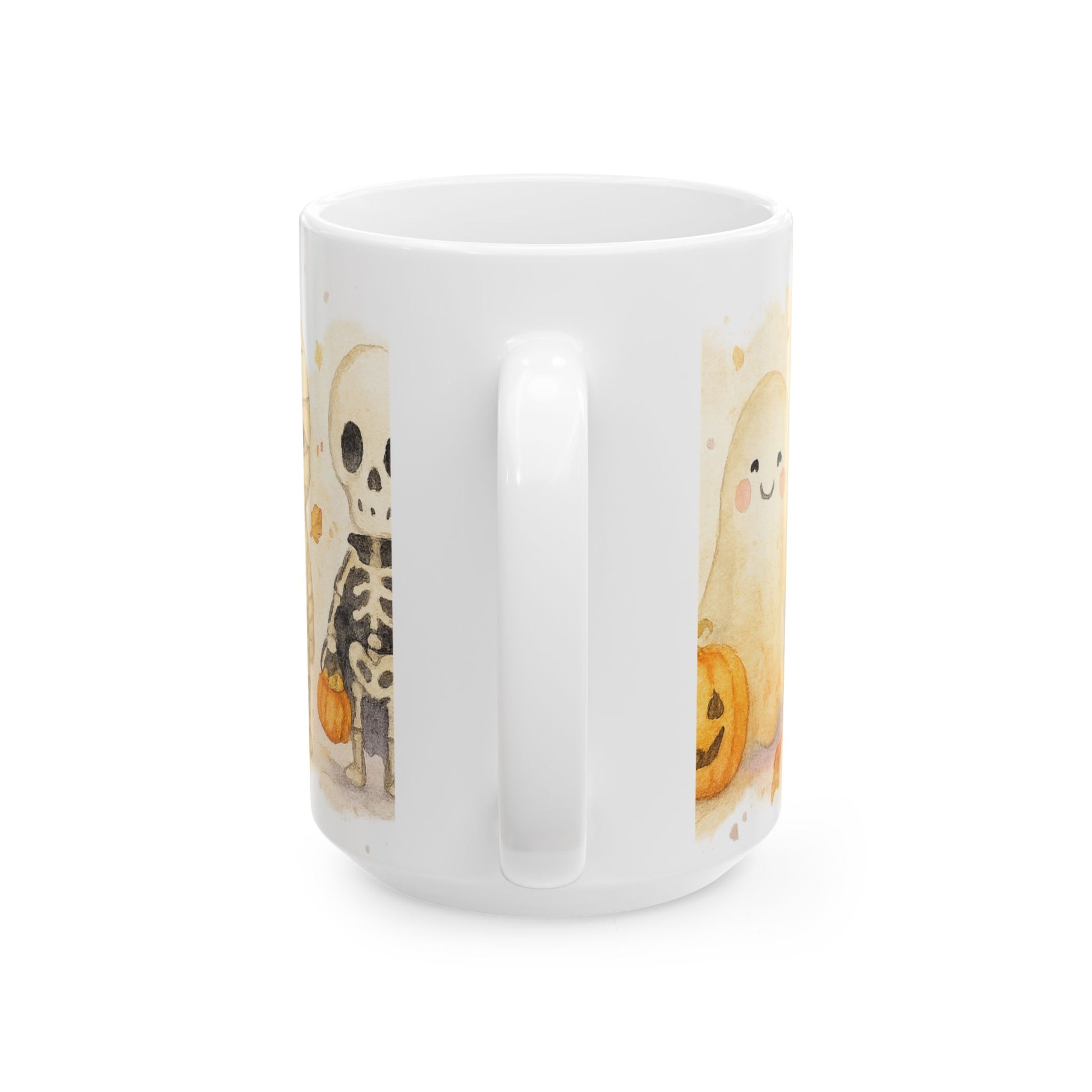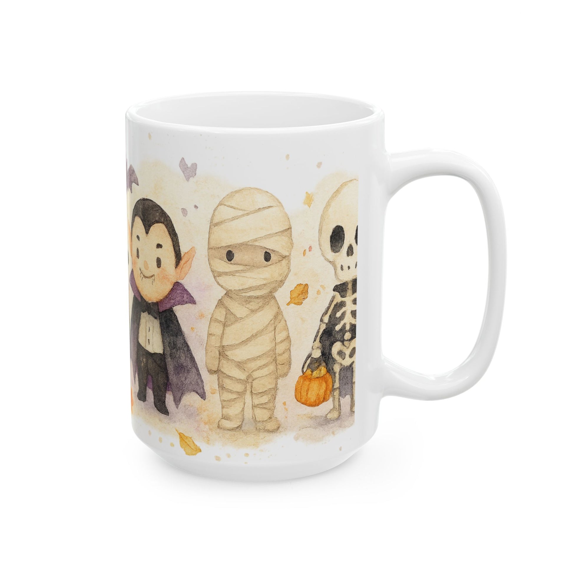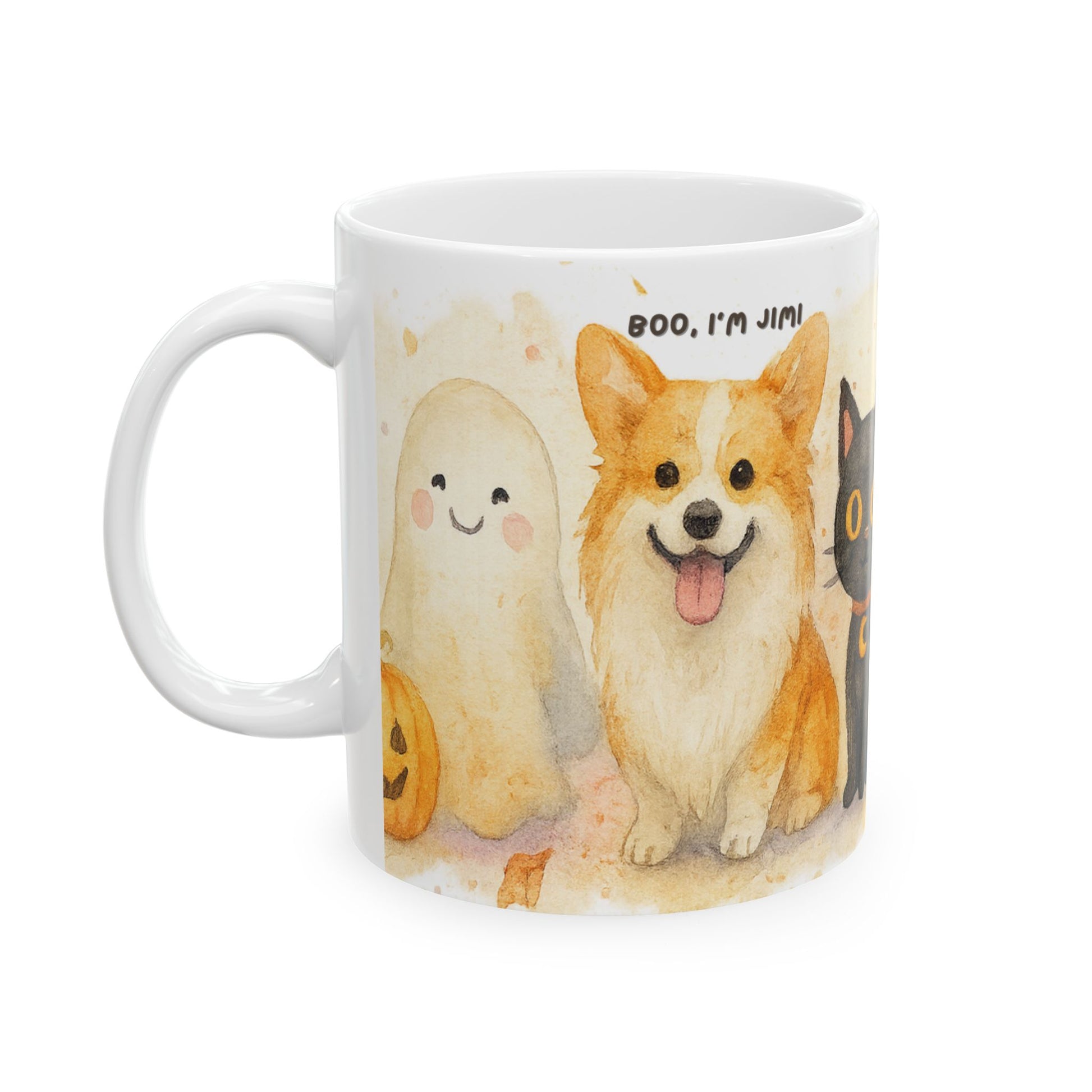 This custom Halloween Pet Mug features your dog or cat illustrated in a hand-painted watercolor effect, placed right into a lineup of adorable spooky characters (ghost, black cat, vampire, mummy, skeleton). Your petβs name is added in a playful handwritten style for a truly one-of-a-kind Halloween keepsake.